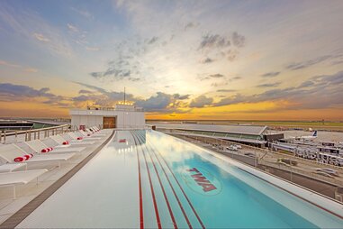 Changi Airport’s reputation precedes it. It’s more like a massive interactive mall that happens to offer flights. It’s also one of those airports that actually is a destination in itself, with visitors coming in daily just to see the nature-themed complex, Jewel, which includes wedding venues and the world’s tallest indoor waterfall. But if you’re more about getting in the water itself, the Aerotel Singapore Transit Hotel can accommodate your needs, with its own outdoor swimming pool which the public can access for around $21 USD.