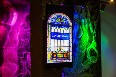 The first thing you see upon entering the Core Social Justice Cannabis Museum in Boston’s Jamaica Plain neighborhood is a digital stained glass window stamped “Cannfessional.” Behind it is a small sound booth, wrapped in cloud-print wallpaper, with a glowing neon chair and a microphone dangling from the ceiling. Facing the chair on the wall is a TV with a camera mounted on top. This is where you reveal your truth.