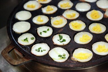 You can find this street food stall at the edge of Chinatown, but the short trek is worth it for their namesake coconut cakes, kanom krok. The small coconut and rice flour pancakes are made to order in a special pan and they come out crisped around the edges. The stall also sells meat skewers and Isaan sausages.