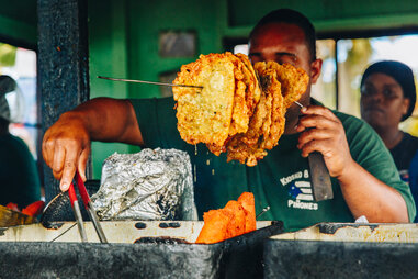 For the full circuit, start early at Piñones, a beachfront town 10 minutes outside San Juan airport along Route 187. Stop, snack, repeat. Hop back in your ride and continue 20-30 minutes east to Luquillo on the eastern coast, continue scarfing, and eventually end your day at El Guavate south near the mountains of Cayey. (Of course, if you want to take a snail’s pace, you could easily spend all day at each of these spots. The choice is yours.)