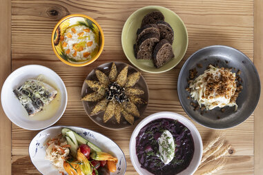 When one door closes, another one swings open. Such is the case with husband-wife duo Johnny Clark and Beverly Kim, who closed their adored Wherewithall, only to replace it with something deeply personal—a Ukrainian restaurant, named after Clark’s grandmother Anelya Ochatchinskiya, and inspired by his Ukrainian-American roots. Homey and warm, Anelya’s main dining room sports a rustic-chic motif with natural elements of wood, plants, and dark green hues. Fermentation and seasonal preservation are a major through line of the menu, starting with signature Zakusky (aka starters and snacks) like Trout Roe Tarts, Fried Crimean Olives, and Herring in cold-pressed sunflower seed oil. These are followed by a Dumpling and Noodle section (try the Varenky with huckleberries, sour cream, and bacon-pecan praline), a pair of Borschts (including one with duck and smoked pears!), Potato Pancakes with sea buckthorn, and Fish and Meat dishes like Smoked Mackerel with marble potatoes and ramps, Beer-Braised Pork Ribs with plum glaze. To drink, the wine list skews heavily Eastern European, while cocktails—like the Blind Beauty martini with horseradish vodka, birch juice, and vermouth—are named after poems and writings from Ukrainian artist Taras Shevchenko.