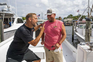 Before the shootout begins, Derrick steps off his boat, approaching Flea at the mic. Grinning, he issues a challenge that elicits whoops from the crowd. He wants Marshall to take a shot using his boat, the Crusher.