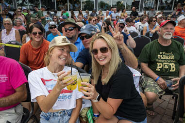 With the challenge accepted, the crowd is buoyed and wolf-whistling.The DJ turns up the country music, while Flea passes a bucket of money to sweeten the pot for the winner. Spectators, well-greased from an afternoon of margaritas and 90-degree heat, ask each other, ‘Who’s it gonna be? Jamie or Derrick?’ A group of older men in the VIP section absorb the scene with glee. After all, they drove seven hours from Cleveland for exactly this.