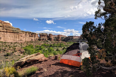 Open year-round, the Willow Flat Campground in Island in the Sky has 12 campsites available on a first-come, first-serve basis for a $15 nightly camping fee. The site is equipped with toilets, picnic tables, fire rings, and views for days—but you’ll need to bring your own drinking water (or stock up outside the visitor center spring through fall). The Needles Campground is also open year-round, and features 26 individual sites and three group sites. RVs can stay at both campgrounds, but the drive can be harrowing.