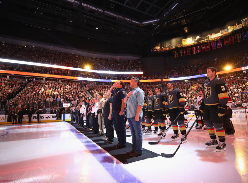At that first home game, the only way to address the shooting was by standing together. A pregame show that was months in the planning was scrapped, and instead, for about two minutes before the action got underway, the T-Mobile Arena stopped being a hockey venue and became a church. As a small group of workers from the Route 91 Harvest festival led the national anthem, more than 18,000 people rose and sang in unison -- joining in early and continuing to the very end. Solemn but loud. Proud and strong. Some cried. Some saluted.