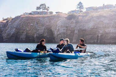 Things to do: Kayak out to the aforementioned sea caves with an Everyday California guide, who will take you through the La Jolla Ecological Reserve (a Marine Protected Area that brags one of the highest concentrations of sea life in California). In addition to kayaking, they offer top-rated whale-watching and snorkeling tours, surf and stand-up paddleboard lessons, and equipment rentals. La Jolla Cove and the Children’s Pool are prime for marine life sightings too. Wild seals and sea lions are almost always lounging or splashing about the shoreline, and the tide pools are swimming with hermit crabs, sea anemones, barnacles, urchins, and more. You’ll encounter even more aquatic creatures at the famous Birch Aquarium at Scripps Institution of Oceanography, which promotes ocean conservation with more than 60 habitats, tanks, and hands-on exhibits.