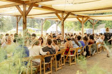 With solarpunk as a guiding light, Schwanz and Scott began their regenerative journey of bringing the soil back to life. The first two years of the farm’s existence, which spans 10 acres of redwoods and mixed native forest, Schwanz says it was largely a dirt lot that required a ton of soil regeneration and new infrastructure. This past year was the first time the land was ready enough to welcome visitors and host demonstrations, workshops, fundraisers, and events like the Big West Wine Fest, which draws natural winemakers from across northern California—and upwards of 1,000 attendees. They also offer an artist-in-residency series, kids’ programming, and hands-on workdays, wherein 10-15 people come to work on the farm for a day, complete with happy hour spotlighting local natural wine (“sort of like volunteer days, but a more fun party spin on it,” Schwanz notes).