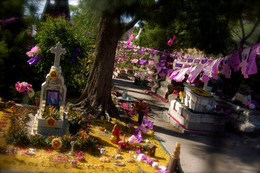 The Purépecha people of Lake Patzcuaro celebrate the holiday with a zeal that’s famous around Mexico. So famous that up to 100,000 visitors descend on the lake each year. Locals nab ducks in the morning (sometimes with atlatls, traditional spear-throwers that can huck a projectile close to 90 mph), then cook them up for a hearty midnight meal at the graveyard. Celebrants are meant to keep vigil all through the night, which is why the festival is usually called Noche de Muertos here.