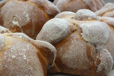 Pan de muerto is a sweet bread eaten for the holiday. Rich and eggy and often flavored with anise or orange flower water, it’s kneaded and shaped to resemble two or more crossed bones.