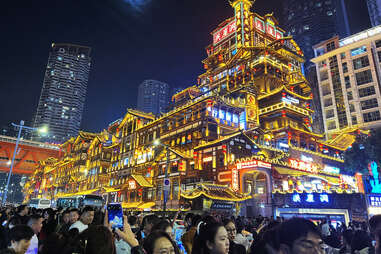 Hongya Cave is an 11-story building complex made up of restaurants, traditional medicine shops, hotels, and market stalls—all built on stilts into the mountainside, facing out onto the Jialing River. At night, it’s an especially breathtaking sight that has been likened to the imaginary town in the Studio Ghibli film Spirited Away, with businesses all lit up and stacked on top of invisible structures that blend into the hillside shadows.