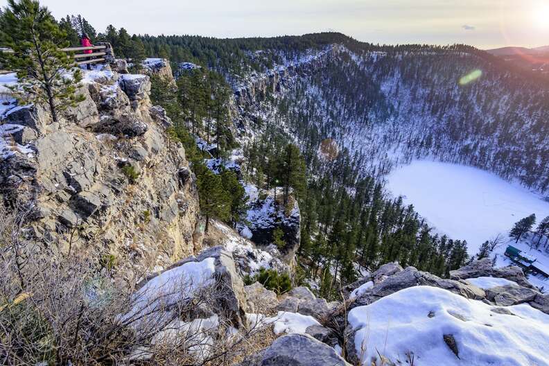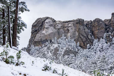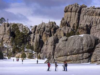 But what I initially mistook for eeriness, I later learned is just the beautiful calm that comes over South Dakota during the winter, when eager road trippers, bikers, and tourists go into hibernation. And no place captures the spirit of South Dakota winter quite like the Black Hills, which turn a stunning white each year. The mountains, monuments, and canyons that attract thousands in the warmer months are left for you to enjoy solo. And rather than a horror movie, South Dakota suddenly feels like the sweeping opening of an epic western set on a cold, vast landscape where anything can happen.