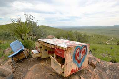In the 1980s, some students at Sul Ross State in Alpine placed a large metal desk on top of the very large Hancock Hill behind the university. It’s still there today. Notebooks left in the desk’s drawers are filled with salutations and sage wisdoms from past visitors.