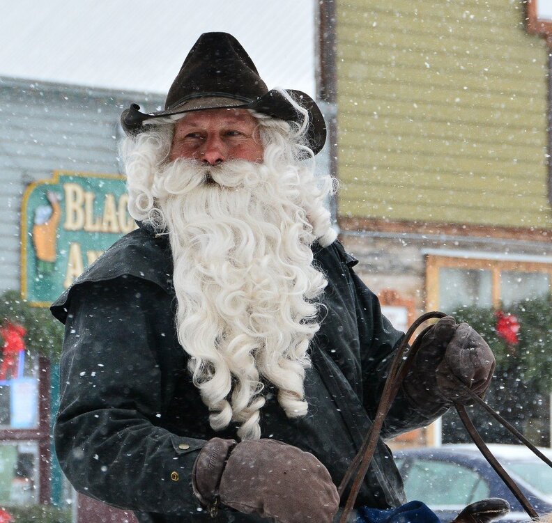 I’m told that when I call I should ask for “Cowboy Claus.” That, plus a couple of pictures I found on the Ovando Old West Christmas Fest page of a mysterious man on horseback is all I have to go on. He’s wearing a long leather duster, blue jeans, and a black cowboy hat. On his face is a familiar—and unmistakable—voluminous white beard.