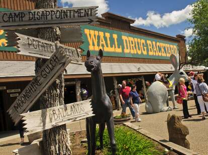 Trying to box Wall Drug into a single category is a little like trying to describe Burning Man (most go with "attraction"). It’s everything, but it’s nothing specific. Wall Drug is a maze of souvenir shops, clothing stores, and benches where you can post up next to dead-eyed statues of Annie Oakley. It’s a place to fill up on Midwestern comfort food, then visit an animatronic T-rex who makes regularly-scheduled roars or be serenaded by band of rickety robot cowboys.