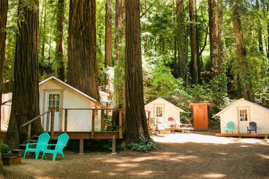 Whether visiting Pinnacles National Park for hiking, rock climbing, or bird watching, you'll want to book a few nights in the park's glamping tents that sleep up to four people. You'll need to bring your own bedding as these tent cabins only come with one queen and two twin beds, two Adirondack chairs, a picnic table, and a fire ring. You'll have easy access to explore the park's staggering rock formations and possibly spot an endangered California condor.