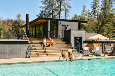 Located on the Six Sigma Ranch and Winery property, this glamping spot an hour from Napa has high-end solar-powered glamping tents that sleep up to five people, and some even have their own bathrooms. All come with barbecues and kitchenettes that are kitted out with everything you need to cook up some bacon and eggs or burgers and hot dogs. Take a dip in the swimming pool, enjoy movies under the stars, or rent an e-bike to explore nearby trails. The property has a central lodge where you can enjoy nightly s'mores and a nearby playground for little ones. Book a wine tasting, visit the farm animals, and tour the Six Sigma property on an all-terrain Pinzgauer.