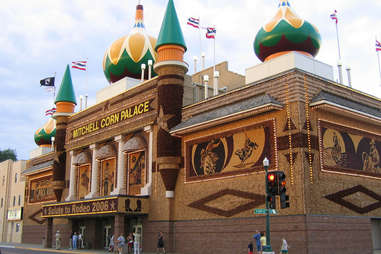 One of the not-so-scenic drives, however, is the trip across I-90 between the Badlands and Sioux Falls. While the 80mph speed limit is nice, the roadside attractions are even better; they include the aforementioned Wall Drug, giant dinosaur statues, a ghost town from the 1880s, and the famous Corn Palace in Mitchell which, as the name might imply, is AN ENTIRE ARENA MADE OF CORN!!!!