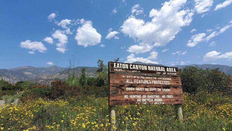 The San Gabriel Mountains are a treasure, a vast and verdant range with fantastic hiking, camping, biking, and more. Wildflowers will bloom throughout the mountains this season and well into summer at higher elevations. But you don’t have to drive way up into the mountains to find flowers. Eaton Canyon is at the top of Pasadena, right at the base of the San Gabriels, and it’s a lovely place to poke around, take a relatively easy hike and examine lots of blooming flowers on your way to the justifiably beloved 40-foot waterfall at the end of the trail.